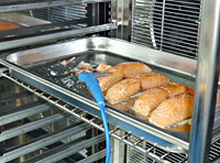 ПРЕДВАРИТЕЛЬНАЯ ПОДГОТОВКА ПЕРЕД ОХЛАЖДЕНИЕМ После приготовления пищи процесс охлаждения должен начаться как можно быстрее – в течение 30 минут. Выложите еду на неглубокий плоский противень, глубиной 40/65 мм, размером 325 на 265 мм или 325 на 530 мм. Не выкладывайте продукт выше, чем на 50 мм на противне. Более глубокие контейнеры могут быть использованы, но только если охлаждающий агрегат достаточно мощный для быстрого понижения температуры продуктов. Кроме того, некоторые виды продуктов требуют разделения на меньшие порции для облегчения охлаждения. Это зависит от размера, формы и плотности продукта – чем больше плотность продукта – тем больше необходимо времени для его охлаждения. Рекомендуется покрыть пищу (пленкой или фольгой), поскольку незакрытые противни будут охлаждаться быстрее. Это делается из соображений безопасности, к тому же закрытие поверхности также уменьшает высыхание пищи, предотвращает проникновение запахов, при одновременном охлаждении разных видов продуктов и предотвращает избыточное обледенение системы заморозки охлаждающих установок из-за избытка влаги внутри агрегата. Содержание влаги в продуктах, возможность пищи удерживать тепло, и температура, при которой она была помещена в охлаждающую установку, — все это влияет на общее время охлаждения. Если вы используете контейнеры, изготовленные из материалов, изолирующих пищу, это также будет влиять на время охлаждения. Другие контейнеры, изготовленные из утилизируемых материалов, должны храниться в санитарных условиях до использования, поскольку вы рискуете занести бактерии, когда будете помещать в них пищу. Как вы видите, существует множество параметров, многие из которых связаны со здоровьем. Каждый пользователь системы Cook& Chillдолжен решить – делить пищу на порции до или после охлаждения. Нет четко рекомендации, поэтому Вы должны рассмотреть, как и когда Вы будете использовать пищу. Для банкета Вы можете извлечь пищу из противня, расположить ее в сервировочной посуде и охладить в таком виде. Для обслуживания в номерах или на круизном теплоходе, Вы можете приготовить индивидуальные порции на закрытых тарелках или в вакуумной упаковке. Для шведского стола пища может быть расположена на блюдах с подогревом. При любом выборе, разделение на порции должно быть произведено в течение 30 минут с момента приготовления, чтобы пищу можно было безопасно охладить. Рекомендуется регулярное измерение температуры пищи в это время и в течение всего процесса приготовления-охлаждения.