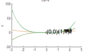 Пример 2. Программа для построения рис. 12 записана в M -файл с именем graf.m. Причем интервал исследования для переменной теперь стал входным параметром программы: function y=graf(x) title('{\itf(x)=x^{n}}'); xlabel('x'); ylabel('y'); hFigure=gcf; set(hFigure, 'Color', [1 1 1]); hText=text; set(hText, 'FontSize', [18]); for n=2: 4 y=x.^n; hold on hPlot=plot(x, y); set(hPlot, 'Color', [1.8/n 0.7 0.5]); set(hPlot, 'LineWidth', 2); if n~=2 for i=1: length(y) s=''; if y(i)==y1(i) hold on plot(x(i), y(i), 'ko'); s=['(' num2str(x(i)) ', ' num2str(y(i)) ')']; hText=text(x(i), y(i)+2, s); set(hText, 'FontSize', [16]); end end end y1=y; s2=['n=' num2str(n)]; hText=text(1.5, 1.5^2*n-1, s2); set(hText, 'FontSize', [14]); end