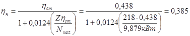 КПД ступени центробежного насоса зависит от размера ступени и ее приведенной подачи. Размеры ступеней погружных центробежных насосов изменяются в относительно небольших пределах, поэтому можно считать, что КПД ступени зависит только от приведенной подачи. Используя исходные данные задания предыдущей части курсовой работы определяем, что для Qприв = 1, 1л/с КПД ступени будет равно η ст=0, 438 (рис.82). КПД насоса определим по формуле П. Д. Ляпкова: