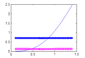 function [FIK, FIR]=F(q, lr) lk=1.51*q^0.333-0.26; RK=1.3*(q+0.3)^0.333; R=lr+RK; KNAP=1; KRAZR=1; a2K=2*q*KNAP/(KRAZR*lk*RK^2); a2R=2*q*KNAP/(KRAZR*lk*(RK+lr)^2); FIK=0; FIR=0; for f=0.1: 1E-4: 1.4 a1=2*f-sin(2*f); if abs(a2K-a1)< = 2E-4 FIK=f; end if abs(a2R-a1)< = 0.5E-4 FIR=f; end end if FIK==0 | FIR==0 disp([' УГОЛ FI НЕ ОПРЕДЕЛЕН в бдоке FI']) end f=FIK; z1=2*f-sin(2*f); f=FIR; z2=2*f-sin(2*f); f=0.1: 0.01: 1.4; a1=2*f-sin(2*f); plot(f, a1, f, z1, 'b: *', f, z2, 'm: +') После вызова М -функции FI.m командой > > q =0.4; lr = 1.6; [FIK, FIR]=F(q, lr); будет построен график (рис. 17).
