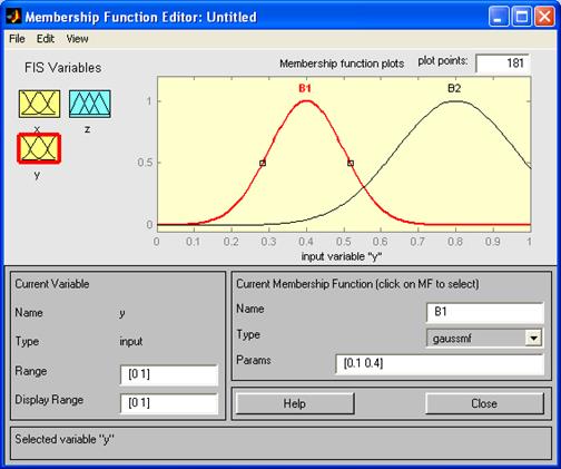 Для переменной y, щелкнув на соответствующей иконке, задаем две гауссовых функции принадлежности (B1 и B2) (параметры выбрать произвольно).