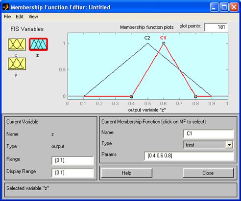 Для переменной z, щелкнув на соответствующей иконке, задаем две треугольных функции принадлежности (C1 и C2) (параметры выбрать произвольно).