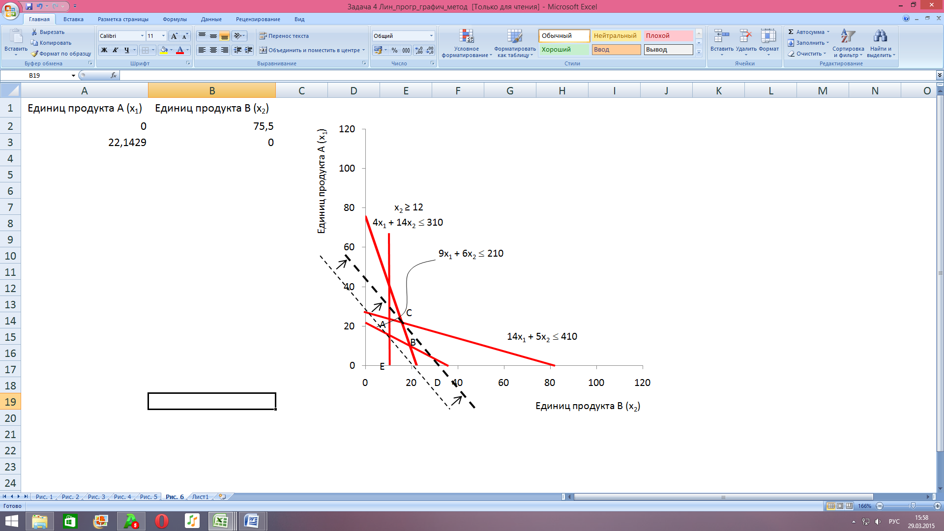 Искомые переменные не могут быть отрицательными числами, что необходимо записать в виде неравенств х1 ≥ 0 и х2 ≥ 0. В нашем примере второе условия является избыточным, так как выше было определено, что х2 не может быть меньше 12. Полная модель линейного программирования для производственной задачи Николая может быть записана в виде: Максимизировать: Z = 2500 * х1 + 3500 *х2 При условии, что: 4 *х1 + 14 * х2£ 310 14 *х1 + 5 * х2£ 410 9*х1 + 6* х2£ 210 х2 ≥ 12 х1 ≥ 0 5. Графический метод решения задачи линейного программирования. На данном этапе был построен график и введены требуемые ограничения для определения решения графическим методом. Кратко методику графического метода решения задач линейного программирования можно изложить следующим образом: