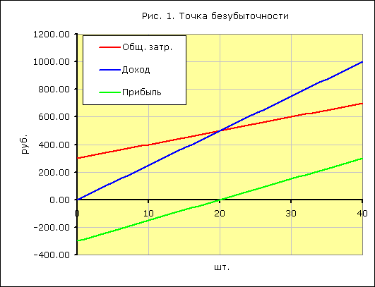 Формула расчета точки безубыточности в денежном выражении: Тбд = В*Зпост/(В - Зпер) Формула расчета точки безубыточности в натуральном выражении (в штуках продукции или товара): Тбн = Зпост / (Ц - ЗСпер) В точке безубыточности линия доходов пересекает и идет выше линии общих (валовых) затрат, линия прибыли пересекает 0 — переходит из зоны убытков в зону прибыли. На приведенном ниже рисунке точка безубыточности Тбн = 20 штук