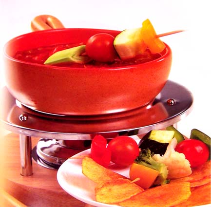 Состав: 175 гр. консервированного перца пимиенто, 1 мелко нарубленная луковица, 50 гр. сливочного мала, 2 зубчика мелко нарубленного чеснока, 450 гр. очень спелых помидоров без кожицы, 1 ч. ложка соевого соуса, соль, черный перец. В фондюшнице пассеруйте лук в сливочном масле до мягкости, добавьте чеснок, нарезанные на кубики помидоры и тушите 10 минут, при постоянном помешивании. Уменьшите огонь, посолите фондю, поперчите, добавьте мелко нарезанный перец пимиенто и соевый соус. К этому насыщенному пряному фондю подайте картофельные чипсы и маленькие овощные шашлычки. Интетерсно, а перец пимиенто и просто жгучий перец - это одно и то же? Фондю с овощными шашлычками