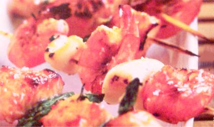 Состав: очищенный от семян и мелко нарезанный красный острый перец, 1 ст. ложка нарезанной петрушки, цедра и сок 1 лимона, 2 раздавленных зубчика чеснока, 3 ст. ложки оливкового масла, 12 свежих очищенных, но с хвостиками королевских креветок, 4-6 штук небольших очищенных от пленки кальмаров. Смешайте перец чили с петрушкой, цедрой и соком лимона, чесноком и олмвковым маслом в стеклянной или керамической миске. Кальмары нарежьте полосками, положите в маринад вместе с креветками и хорошо премешайте - морепродукты должны быть полностью покрыты маринадом. Накройте и оставьте мариноваться на 20-30 минут в холодильнике. Попеременно нанизывайте на шампуры по 3 креветки и 2 куска кальмара, посолите и жарьте на углях по 2-3 минуты на каждой стороне. Готовые креветки покраснеют, а кальмары побелеют, если пережарите, то они станут жесткими и безвкусными. Шашлык из рыбы