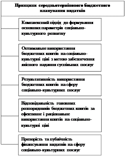 Враховуючи те, що більшість стратегічних завдань соціально-культурної політики розробляються на кілька бюджетних років і закріплені у відповідних програмах, то на практиці програмно-цільовий метод бюджетування має реалізовуватись в умовах середньотермінового планування. Згадане планування є важливим інструментом управління бюджетними коштами, котрий сприяє підвищенню ефективності прийняття фінансових рішень, відкритості процесу управління і прозорості прийняття рішень. При цьому прогнозування бюджетних ресурсів та їхнє використання повинно ґрунтуватися на науково обґрунтованих принципах, зображених на рис. 3.1. Окрім того, в умовах нестабільності розвитку економіки України при здійсненні планування видатків на сферу соціально-культурних послуг необхідно враховувати показники, котрі характеризують динаміку і пропорції розвитку економіки, а саме: інфляції, обмінного курсу національної валюти, державного боргу та їхні зміни у прогнозованому періоді. Аналізуючи та прогнозуючи появу таких проблем, доцільно розробити комплекс заходів щодо коригування соціально-культурної політики держави: - оцінити обсяг видатків у розрізі головних розпорядників бюджетних коштів за роками відповідного періоду. При недостатньому обсязі наявних коштів, варто здійснити пошук додаткових джерел їх залучення; - розробити організаційний механізм реалізації програмних заходів з метою забезпечення прийняття оптимальних управлінських рішень, спрямованих на вирішення певних завдань за умови мінімізації сукупних ресурсів та досягнення головної мети програми. Перевагами такого механізму є те, що в його межах визначаються виконавці, котрі наділені відповідними повноваженнями та несуть відповідальність за кінцевий результат.