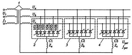2.2 Преобразователи частоты Преобразователем частоты называется преобразователь напряжения переменного тока стандартных частоты и напряжения в напряжение переменного тока регулируемой частоты. Применительно к схемам ЭП одновременно с частотой в определенном соотношении регулируется и выходное напряжение преобразователя. Полупроводниковые преобразователи частоты (ПЧ) делятся на две группы: преобразователи с непосредственной связью и преобразователи с промежуточным звеном постоянного тока. Силовая часть схемы трехфазного преобразователя частоты с непосредственной связью показана на рисунке 15.9. Он образован тремя группами 2, 3 и 4-х тиристоров VS 1 – VS 6 включенных между вторичными обмотками трансформатора 1 и нагрузкой Za, Zb и Zc. Регулируемое по частоте f рег на нагрузке формируется из напряжения источника питания (трансформатора) Ua, Ub и Uc, что и определило название этого типа преобразователя частоты. Частота напряжения на нагрузке может регулироваться только вниз от сетевой f1, и ее максимальное значение обычно не превосходит 20 Гц, что определяет ограниченные возможности применения этого типа преобразователя частоты.