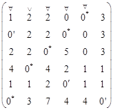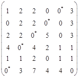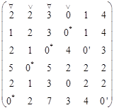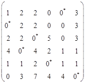 Підраховуємо кількість зірочок у матриці (6.9). Оскільки їх менше, ніж Далі наведемо низку перетворень матриць після дії вказаних пунктів алгоритму. Матриця після виконання пп. 3, 4, 5, 6, 7, 5, 6, 7, 5: