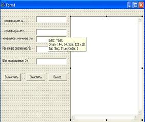 данные: переменные a, b, dx и s вещественного типа. С целью использования для ввода данных поля компненты Edit необходимо использовать функции преобразования типов. 5. Переменной x присваивается начальное значение: x=xn; 6. Цикл – оператор цикла с постусловием do…while (условие): do if (x< 2.8) {i=1; s=(a+b)/(exp(x)+cos(x)); } else if (x> =2.8 & & x< =6)