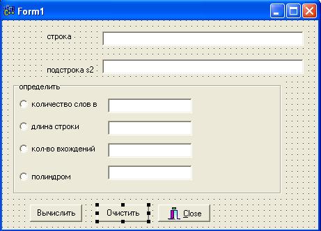 4. Проверить, является слово словом полндромом. if (RadioButton4-> Checked) { i=st.Length()/2; s2=st; if (st.Length()/2*2! =st.Length()) //проверяем на четность длинк строки { st.Delete(1, i); // если длина строки нечетная s2.Delete(i+2, i); } else {st.Delete(1, i); // если длина строки четная s2.Delete(i+1, i+1); } s2=AnsiString(strrev(s2.c_str())); k= AnsiCompareText(st, s2); // или k=AnsiStrIComp(st.c_str(), s2.c_str()); if (k==0) Edit6-> Text=" слово полиндром"; else Edit6-> Text=" слово не полиндром"; } else Edit6-> Clear();