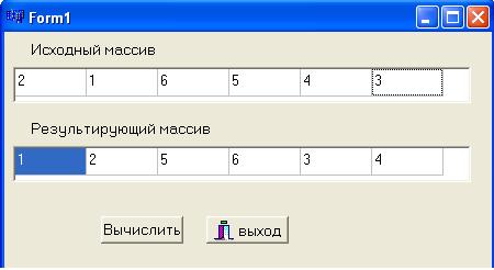 void __fastcall TForm1:: Button1Click(TObject *Sender) { int i, a[SZ]; /* описание переменной i и массива а целого типа */ StringGrid1-> SetFocus(); /*передача фокуса*/ for (i=0; i< SZ; i++) a[i]=StrToInt(StringGrid1-> Cells[i][0]); /*ввод исходного массива*/ reverse(a); /*обращение к функции reverse*/ for (i=0; i< SZ; i++) StringGrid2-> Cells[i][0]=IntToStr(a[i]); /*вывод полученного массива */