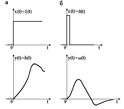 Структура характеристичного рівняння (2.24) співпадає з структурою лівої частини диференціального рівняння, записаного в символічній формі (2.3) і з структурою власного (характеристичного) оператора D(p) (2.4). Тому при записі характеристичного рівняння часто замість символу l, котрий означає невідому заміну алгебраїчного рівняння, використовують символ р. Але при цьому р означає вже не операцію диференціювання, а деяке комплексне число, яке є розв’язком (коренем) характеристичного рівняння. Для лінійних елементів і систем, крім принципу суперпозиції, справедливе ще одне загальне правило: реакція на неодиничну ступінчасту дію Імпульсною перехідною функцією Якщо вхідна дія являє собою неодиничний імпульс Імпульсна перехідна функція