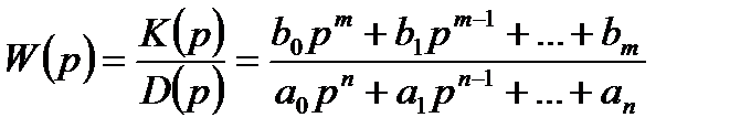 Порівнюючи рівняння (2.37) з рівнянням у символічній формі (2.3), можна помітити повну аналогію їх структур. Різниця рівнянь лише в значенні символа р: в першому рівнянні він означає операцію диференціювання, в другому – комплексну змінну. Введемо тепер поняття передавальної функції. Передавальною функцією W(p) називають відношення зображення вихідної величини до зображення вхідної величини при нульових початкових умовах