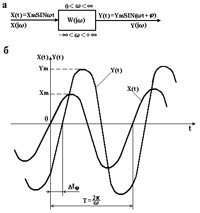 2.4 Частотні характеристики Частотні характеристики описують передавальні властивості елементів і систем в режимі встановлених гармонічних коливань, викликаних зовнішніми гармонічними діями. Знаючи частотну характеристику елемента, можна визначити його реакцію на гармонічну дію будь-якої частоти, а також на суму гармонічних дій різної частоти. Частотні характеристики широко використовуються в теорії і практиці автоматичного керування, так як реальні умови, що діють на автоматичні системи, можуть бути представлені як сума гармонічних сигналів. Позитивною властивістю частотних характеристик є те, що вони можуть бути безпосередньо визначені експериментальним шляхом. Розглянемо фізичну сутність і різновид частотних характеристик. Нехай на вхід лінійного елемента (рис. 2.3, а) в момент часу