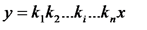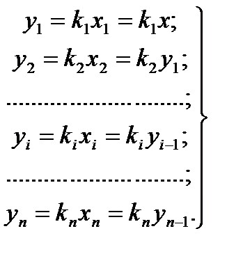 2.5 Статичні характеристики типових з’єднань елементів Алгоритмічна структура будь-якої автоматичної системи управління являє собою комбінацію трьох типових з’єднань елементів: послідовної, паралельної і обернено-паралельної дії. Кожне з’єднання може бути за простими правилами замінене одним елементом, статичні і динамічні властивості якого еквівалентні властивостям з’єднання. При послідовному з’єднанні (рис. 2.6, а) вихідна величина кожного попереднього елемента є вхідною для наступного (і тільки для нього одного). Якщо елементи лінійні і в статиці характеризуються передавальними коефіцієнтами