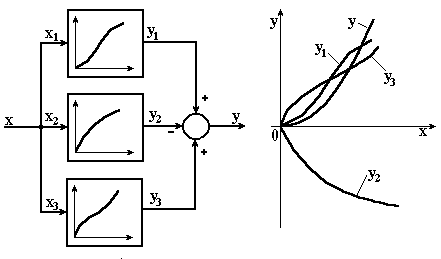 Вираз (2.81) показує, що негативний зворотний зв’язок зменшує відхилення вихідної величини, яке виникає через нестабільність коефіцієнта прямого ланцюга, в Приведені викладки ілюструють стабілізуючі дії негативного зворотного зв’язку при параметричному збуренні – при зміні параметра охоплюючої ланки. В главі 6 буде показано, що негативний зворотний зв’язок стабілізує вихідну величину і при координатних збуреннях. Саме дякуючи цьому, негативний зворотний зв’язок лежить в основі всіх замкнутих систем керування. Розглянемо тепер методи одержання еквівалентних статичних характеристик з’єднань, які складаються з нелінійних елементів. В цьому випадку не можна використовувати формули (2.67), (2.72) і (2.77), еквівалентні характеристики доводиться визначати графічно. На рис. 2.7 показано, як можна послідовним переносом точок побудувати еквівалентну статичну характеристику послідовного з’єднання трьох елементів з нелінійними характеристиками (рис. 2.7, а). На рис. 2.8, б показано побудову еквівалентної характеристики паралельного з’єднання трьох нелінійних елементів (рис. 2.8, а). Вихідні сигнали першого і третього елементів підсумовуються, а вихідний сигнал другого – віднімається. Тепер розглянемо зустрічно-паралельне з’єднання (рис. 2.9, а). В першому квадранті на рис. 2.9, б побудована характеристика елемента прямого ланцюга Повторюючи цю процедуру для кількох значень вихідної величини, отримаємо характеристику з’єднання з негативним зворотним зв’язком (лінія 1). За допомогою аналогічних міркувань і побудови можна отримати еквівалентну характеристику для додаткового зворотного зв’язку (лінія 2).