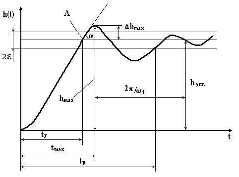 Час регулювання і перерегулювання, основні показники перехідного процесу, тісно пов’язані між собою. На перший погляд може здатися, що перерегулювання недопустиме, так як воно збільшує час регулювання. Однак це не так. Переважно перерегулювання появляється внаслідок того, що система до нового встановленого стану підходить з певною швидкістю, яка графічно відображається тангенсом кута нахилу дотичної в точці А (рис. 4.11).