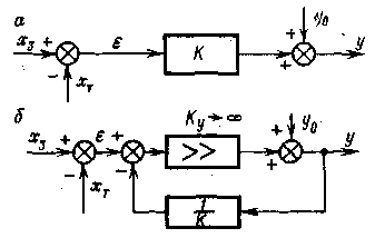 Крім того, в реальних регуляторах зважаючи на їх деяку інерційність закон регулювання дещо відрізняється від ідеального (рис. 6.7, а, пунктир). Рівняння (6.10) може бути реалізовано структурою, що показана на рис. 6.8, а. Для підвищення динамічної точності П-регулятора його часто реалізують у вигляді підсилювача з більшим коефіцієнтом підсилення, охопленого від’ємним зворотнім зв'язком, як це показано на рис. 6.8, б. Тоді в відповідностю з цією структурою передавальна функція регулятора визначиться з виразу