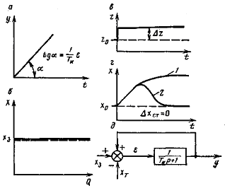 а —закон регулювання; б — статична характеристика системи з І-регулятором; в — графік перехідного процесу в системі з І-регулятором; г — структурна схема Рисунок 6.9 – Характеристики І-регулятора: