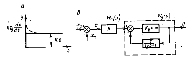 Закон регулювання при стрибкоподібному відхиленні поточного значення регулюючого параметра від заданого показаний на рис. 6.9, а. Вираз (6.13) в диференціальній формі має вигляд