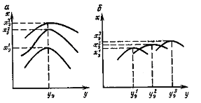 З допомогоюю ПІД-регулятора можна здійснити, будь-який лінійний закон регулювання. При ТД=0 і нескінченно великій величині Ті одержимо П-регулятор. При ТД=0, встановивши достатньо малі значення К і ТА, але так, щоб відношення К/Ті було істотним, отримаємо І-регулятор. При ТД=0 і кінцевих значеннях К і Ті матимемо ПІ-регулятор, а при нескінченно великому значенні Ті і кінцевих значеннях К і ТД—ПД-регулятор. Екстремальними називають регулятори, які визначають і підтримують режим роботи об'єкту регулювання, відповідних екстремуму функції, що характеризує цей ре жим. Необхідною умовою екстремального регулювання є наявність екстремуму статичної характеристики об'єкту, яка залежно від зовнішніх умов може зміщуватися (рис. 6.14). Причому якщо екстремум хе змінюється тільки по величині при незмінному значенні вхідної регулюючої дії уе (рис. 6.14, а), то достатньо один раз визначити положення екстремуму, а потім використати звичайну систему автоматичного регулювання (стабілізації). В другому випадку (рис. 6.14, 6) доцільно застосувати екстремальний регулятор, який разом з об'єктом утворює систему екстремального регулювання. Екстремальні системи відносяться до пошукових систем регулювання, в яких операція пошуку використовується для отримання додаткової інформації про об'єкт і визначення екстремуму. Процес пошуку здійснюється пробними регулюючими діями. Якщо пробна дія у на об'єкт викликає наближення регульованої величини х до екстремуму, то дія повторюється в тому ж напрямі. якщо пробна дія віддаляє регульовану величину від екстремуму, то напрям дії змінюється на зворотній.