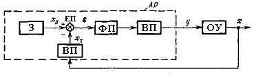 На управляючий пристрій УП поступає інформація про мету і задачі управління (завдання 3) і інформація х про стан об'єкту управління ОУ. На основі одержаної інформації управляючий пристрій виробляє управляючу дію у. Для реалізації системи управління відповідно до цієї схеми необхідно знати (одержати) математичну модель об'єкта управління (див. розділ перший) і вибрати управляючий пристрій. Одна із задач при побудові систем управління — підтримання найістотніших технологічних параметрів об'єкту управління біля їх наперед заданих значень (автоматичне регулювання). У таких випадках як управляючий пристрій використовуються автоматичні регулятори. У функціональній схемі системи управління (рис. 6.2) елемент порівняння ЕП порівнює поточне значення регулюючого параметра хt, що виробляється вимірювальним пристроєм ВП, з його заданим значенням х3, що поступає від задатчика 3, і посилає сигнал розузгодження (відхилення) e на вхід формуючого пристрою ФП.