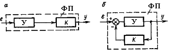 Роль останнього — отримання певного закону регулювання, під яким розуміється залежність між розузгодженням e і вихідною величиною регулятора у. Елемент порівняння і формуючий пристрій разом складають регулюючий пристрій. Сигнал з виходу формуючого пристрою поступає на вхід виконавчого пристрою ВП, який реалізує вироблений регулятором закон регулювання. Формуючий пристрій звичайно реалізується або у вигляді послідовного з'єднання підсилювача П(У) і коректуючого елементу К (рис. 6.3, а), або шляхом обхвату підсилювача (рис. 6.3, б) або ряду елементів в прямому колі регулятора зворотним зв'язком. Іноді обидва способи використовуються спільно, тобто в регуляторі застосовуються як послідовне включення коректуючого елементу, так і зворотний зв'язок.