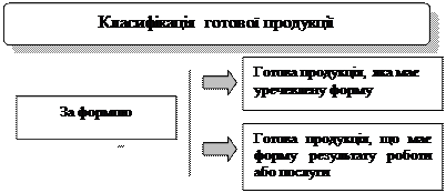 Рис. 9.1 – Класифікація готової продукції Супутня продукція – це продукція, отримана в одному технологічному циклі (процесі) одночасно з основною. За якістю вона відповідає стандартам і призначена для подальшої обробки або відпуску споживачам. Супутня продукція як вихідний елемент виробничого процесу має якісні та кількісні параметри, які повинні одержати вартісну характеристику. Побічна продукція – це продукція, яка іноді утворюється в комплексних виробництвах при виробництві основної і, на відміну від супутньої, не потребує додаткових витрат. У поточному обліку продукція (роботи, послуги) групуються за укрупненими позиціями: вироби основного виробництва; товари широкого вжитку, вироблені з відходів; запасні частини; виконані роботи та надані послуги.