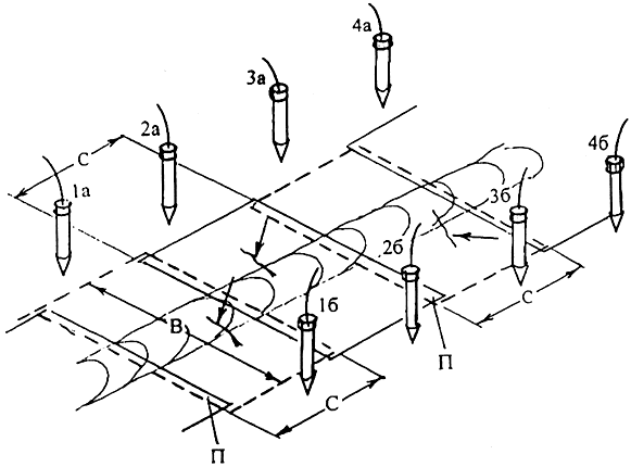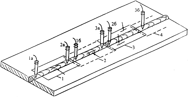 На рис.П.11.2 показана схема последовательной установки электроконтактов 1а-1б, 2а-2б, 3а-3б при контроле СПП протяженного сварного шва с использованием постоянного или выпрямленного тока с целью выявления поперечных дефектов (показаны стрелками). Для обеспечения перекрытия КУ (1, 2, 3, 4) расстояние между электроконтактами 2а и 1б, 3а и 2б,..., должно быть не менее 20 мм. Силу тока определяют в соответствии с рекомендациями п.П.11.2.1.