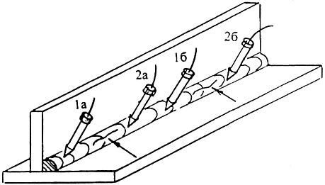 Рис.П.11.7. Схема установки электроконтактов при контроле по участкам наружного протяженного сварного шва углового соединения для обнаружения продольных трещин (показаны стрелками): 1а-1б, 2а-2б - положение электроконтактов при последовательной их установке на участках сварного шва.