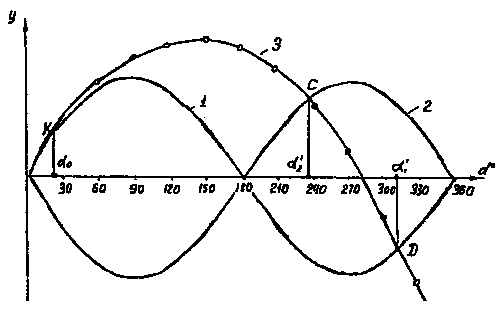 Найти точки пересечения С и Д этих кривых с траекторией полета частиц (график 3), из этих точек находят углы α 1 и α 2. Точка С характеризует на рисунке 4, 3 момент встречи падающего крупного вороха с поверхностью поднимающихся вторых клавиш на рисунке 4, 1 откладывают этот угол и находят точку Е показывающую положение первых клавишей в этот момент, а затем определяется точка А смещения на 1800 по дуге окружности от точки С. Точка Д характеризует момент встречи падающего мелкого вороха с поверхностью первых клавишей колена, которых повернуты к этому моменту на угол α 2. Для определения точки Д на рисунке 4.1 откладывают угол α 1, находится точка В а затем по горизонтали и точка Д перемещение вороха за одно подбрасывание по направлению к выходу из молотилки. Обозначим для крупного вороха –Sк, для мелкого –Sм как показано на рисунке 4.1
