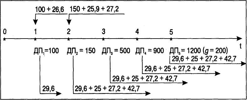 1) Фактор S5 фонда возмещения единицы погашения кредита через 5 лет при ставке депозита в 15% (см. функцию 3 из таблицы шести функций сложного процента для ставки процента в 15%) составляет 0, 148; 2) взнос xg на фонд возмещения 200 ден. ед. задолженности через пять лет при ставке депозита в 15% тогда равен 0, 148 х 200 - 29, 6 ден. ед.; 3) в первый год остаточного периода бизнеса потребный вспомогательный 4) тогда общий взнос u1 на фонд возмещения этой увеличенной задолженности окажется равным величине хg, т. е. 29, 6 ден. ед.; 5) во второй год остаточного периода бизнеса потребный вспомогательный 6) в таком случае общий взнос u2 на фонд возмещения всей увеличившейся задолженности окажется равным сумме (xg + S5-1 x z1) = 29, 6 + 0, 200 х 129, 6 = 55, 5 ден. ед.; 7) общий взнос u3 в следующем, третьем году бизнеса (тогда уже не нужно будет брать дополнительной вспомогательный кредит, так как в этом году ожидаемый денежный поток по бизнесу положителен) может быть рассчитан так: (xg + S5-1 х z 1 + S5-2 х z 2) = 29, 6 + 0, 200 х 129, 6 + 0, 288 х 203, 1 = 114, 4 ден. ед.; 8) с учетом необходимости платить проценты по кредиту (z1 = 129, 6) начиная со второго года и по кредиту (z 2 = 203, 1) взнос и2 увеличивается на 129, 6 х 0, 21 = 27, 2 ден. ед., а взносы ut во все последующие периоды увеличиваются с уровня и2 еще на 203, 1 х 0, 21 = 42, 7 ден.ед.; тогда: и2 = 82, 7; и3 = и4 = и5 = 125, 4; взнос и2 уже заложен в сумме дополнительно привлекаемого кредита z2; взносы же в периоды начиная с третьего года следует вычитать из денежных потоков оцениваемого бизнеса. Обеспечение финансовой автономности рассматриваемого бизнеса, таким образом, можно представить на следующей схеме.