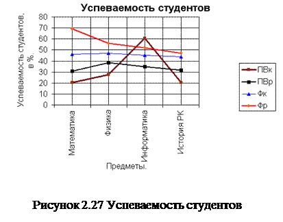1. В меню Диаграмма выберите Тип диаграммы. 2. В открывшемся диалоговом окне на вкладке стандартные выберите График, на правой стороне данного диалогового окна Тип диаграммы Вид: выберите первый график отображения. 3. Дважды щелкните левой кнопкой мыши, на графике появится диалоговое окно Формат области построения на вкладке Рамка выбрать Цвет - Авто. На вкладке Заливка отметить флажком пункт прозрачная, ОК. 4. На ряде «ПВк» диаграммы дважды щелкните левой кнопкой мыши. В диалоговом окне Формат ряда данных на вкладке Вид выберите тип линии, цвет, толщину. Установите тип маркера, цвет, фон и его размер. Нажмите ОК. Проделайте те же действия с тремя оставшимися кривыми. 5. Наведите указатель мыши на область построения диаграммы Ось значений (появится всплывающая подсказка), дважды щелкните левой кнопкой мыши, в появившемся диалоговом окне Формат оси на вкладке Шкала установить цену промежуточных делений равной 5. 6. На области диаграммы выполните двойной щелчок. В диалоговом окне Формат области диаграммы на вкладке Шрифт установите - Times New Roman, размер 12. 7. В меню Диаграмма |Параметры диаграммы на вкладке Заголовки набрать: - название диаграммы (Успеваемость студентов); - подписи осей X и Y. Нажмите ОК. 8. На вкладке Линии сетки Ось Х (категорий) поставте галочку у пункта Промежуточные линии, нажать ОК;