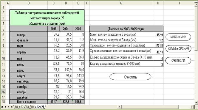 Подготовьте макрос для нахождения суммарного и среднемесячного количества осадков за 3 года. Привяжите созданный макрос к графическому объекту.