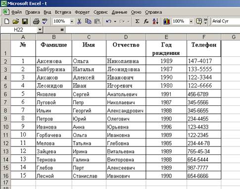 7. Создайте макрос Сортировки таблицы по фамилии и имени (выделив В1-F16).