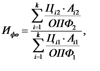 где Цi1, Цi2 - цена единицы продукции соответственно в предыдущем и последующем году; Аi1, Аi2 - объем выпускаемой продукции (работ, услуг) i -ой номенклатуры в натуральном выражении соответственно в предыдущем и последующем году; ОПФ1, ОПФ2 - стоимость основных фондов (среднегодовая) соответственно в предыдущем и последующем году; k — количество номенклатурных позиций выпускаемой продукции (работ, услуг).