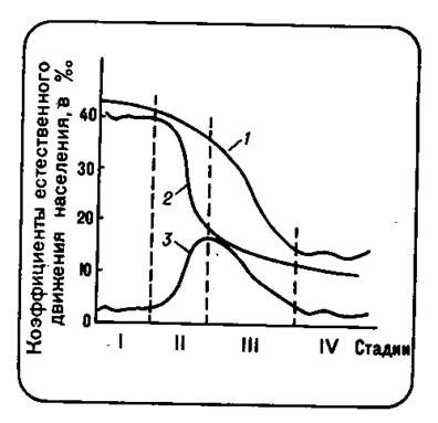 Основные демографические характеристики популяции человека такие же, как популяционные характеристики других видов животных. Это рождаемость, смертность, естественный прирост (все – на 1000 человек населения в год), средняя продолжительность жизни, а также характерные только для человека - фертильность (коэффициент рождаемости: количество детей на одну женщину), смертность новорожденных и другие. Развитие демографической ситуации в ХХ веке имеет некоторые закономерности, которые можно обозначить как фазы демографического перехода (Рис. 7). I фаза характеризуется высокой рождаемостью и Рисунок 7. Фазы демографического перехода (1 – рождаемость, 2 – смертность, 3 – естественный прирост)