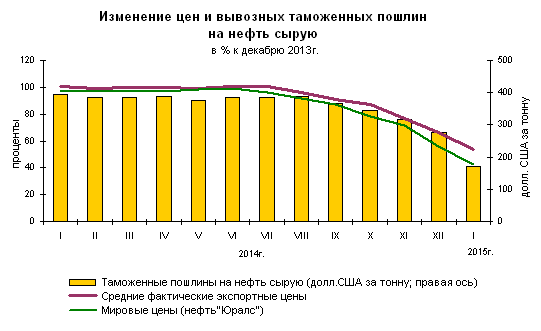 В январе 2015г. средняя фактическая экспортная цена на нефть составила 399, 9 доллара США за 1 тонну (81, 0% к декабрю 2014г.). Цена мирового рынка на нефть " Юралс" составляла 340, 0 доллара США за 1 тонну (76, 3% к декабрю 2014г.).