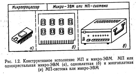 ми — различными контроллерами и адаптерами — конструкция микро-ЭВМ или МП-системы выполняется в виде нескольких печатных плат, заключенных в общий корпус. Габариты таких изделий, например персональных компьютеров, как правило, достаточно малы, и они представляют собой настольные ЭВМ. С дальнейшим развитием технологии микроэлектроники, увеличением количества транзисторов на одном кристалле характеристики и конструкция МП, а также конструкции микро-ЭВМ и МП-систем претерпят изменения. Так, например, биполярные МП в перспективе будут одно кристальными. С размещением на кристалле МОП-микро процессора блоков памяти, таймера и интерфейсных схем он превратится в однокристальную микро-ЭВМ.