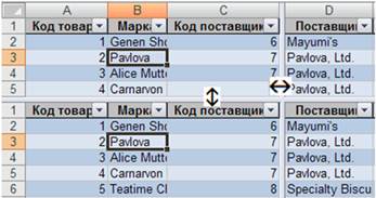 Рис. 3. 2. Изменение размеров отдельных частей разделенного листа - Для удаления панелей выберите вкладку ленты Вид и в группе Окно и вновь щелкните на кнопке Разделить. - Разделение листа будет снято. - Более быстрый способ установки/снятия разделения листа заключается в перетаскивании вешек разбиения вниз или влево (рис. 3.3). Вешки разбиения располагаются в верхней части вертикальной полосы прокрутки или, соответственно в правой горизонтальной полосы прокрутки.