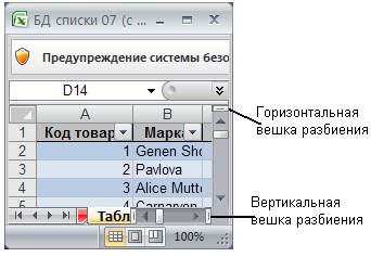 Рис. 3. 3. Горизонтальная и вертикальная вешки разбиения листа - Чтобы снять разделения окна, перетащите вешку разбиения в исходное положение или дважды щелкните мышью на линии разделения