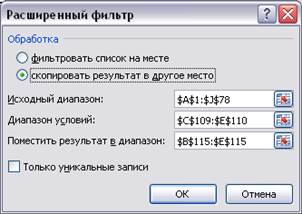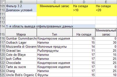 - В ячейках В109: F115 организуйте область критериев и область вывода данных (рис. 5.22).