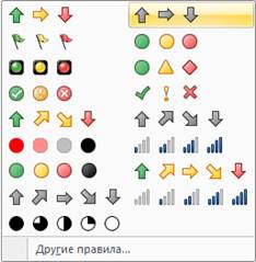 Рис. 5. 27. Выбор набора значков для условного форматирования интервала значений - Выберите, например, вариант 3 серые стрелки. Произойдет следующее форматирование (рис. 5.28.а).