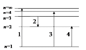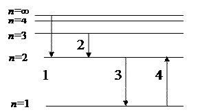 Який із переходів, зображених на схемі енергетичних рівнів атома водню відповідає поглинанню найбільшої довжини хвилі ультрафіолетової серії?