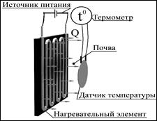 Рисунок – 3. Установка для измерения теплофизических коэффициентов импульсным методом Установка обычно состоит из исследуемого образца, нагревательного элемента и датчика температуры. Часть образца, находящаяся между нагревательным элементом и датчиком температуры, является исследуемым участком, при этом, необходимо обеспечивать хороший тепловой контакт нагревателя и датчика с исследуемыми образцами почвы. Характерной особенностью любого импульсного метода является наличие максимума температуры tm исследуемой точки среды после прекращения действия источника тепла. Время tm наступления максимума и его величина зависят от теплофизических параметров среды и определяются на основе решения уравнения Фурье с известными граничными условиями. В общем случае (при