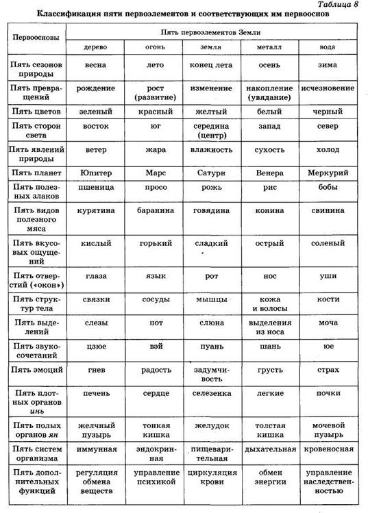 скольку космические первоэлементы материальны, то и организм материален; поскольку все части организма связаны между собой, то организм, естественно, представляет собой единое целое. Древнекитайские врачи как в диагностике, так и в лечении обнаруживали целостный подход к пониманию сущности природы человека и его заболеваний. Они были убеждены в том, что человек является составной частью окружающей природы и находится с ней в постоянных и тесных взаимных отношениях. В систему пяти первоначал хорошо укладываются многообразные связи и отношения человека, его организма с окружающим миром. В трактате «Шу цзин» в главе «Великий закон» так говорится о свойствах человека, которых также пять: «О пяти способностях человека. Первая — внешний облик, вторая — речь, третья — зрение, четвертая — слух, пятая — мышление. Свойство внешнего облика — это достоинство, речи — следование истине, зрения - острота, слуха — тонкость, мышления — проницательность. Достоинство создает строгость поведения, следование истине создает аккуратность, острота зрения создает прозорливость, тонкость слуха создает осмотрительность, проницательность создает мудрость». В книге «Су вэнь» сказано, что жизнь человека образована энергией ци Неба и Земли и находится под влиянием четырех времен года. Энергия весны направлена на физическое и духовное рождение, смену старого новым, очищение. Ей свойственны умеренность и мягкость. Этому сезону соответствует ян. Энергия лета, как и энергия конца лета, — это красота, сила, мощь. Нужно дать возможность проявиться этим качествам, так как они соответствуют энергии ян, которая должна нормально циркулировать в летний период, то есть стремиться к выходу наружу. Лето — это ян. Энергия осени — это состояние внутренней наполненности, что является результатом покоя и уверенности. Необходимо стремиться к самоуглубленности. Осень — это инь. Энергия зимы требует сохранения духовной энергии путем сбережения тепла. Все, что накоплено в предыдущие сезоны, необходимо использовать аккуратно и бережно, чтобы оставить силы для весны. Зима — это инь. Каждая сезонная энергия соответствует одному из пяти первоэлементов; они, в свою очередь, связаны с органами, поэтому сезонные энергии благоприятно воздействуют на органы: на печень — энергия весны; на сердце — энергия лета; на селезенку — энергия конца лета; на легкие — энергия осени; на почки — энергия зимы. Совокупность воздействий оказывает положительный эффект на духовную энергию, которую нужно поддерживать в гармонии. В восьмом разделе «О разных указаниях» главы «Великий закон» трактата «Шу цзин» рассматриваются пять явлений природных сил: «Существуют явления природы: дождь, солнечное сияние, жара, холод и ветер, и существует сезонность их действия. Дождь должен увлажнять, солнце — высушивать, жара — выращивать, холод — завершать вырастание, а ветер — укреплять растения; все они должны действовать в соответствующее время. Если наличествуют все эти пять явлений природы и каждое из них проявляется в соответствующей ему последовательности, то многочисленные растения пышно произрастают. Если же одно слишком обильно, то это вызывает бедствие, и если какое-либо одно слишком не- достаточно, то это тоже вызывает бедствие». Пять природных сил могут воздействовать на организм челов