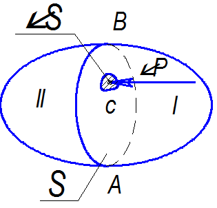 Поділимо площиною АВ даний об’єм рідини на дві частини. Рідина, заключна в І частині буде діяти на ІІ частину по площині АВ. Позначимо площину поділу через S уявно відкинувши верхню І частину. Тоді для збереження рівноваги нижньої частини замінимо на силу Р, що називається силою гідростатичного тиску яка діє на площу S. Поділив силу гідростатичного тиску Р на величину площі S, отримаємо середнє значення гідростатичного тиску.