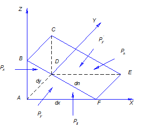 Ця властивість може бути доведена наступним чином: виділимо нескінченно малу призму із сторонами dx, dy, dz та dn. Розглянемо умови рівноваги під дією зовнішніх сил. Такими силами будуть сили гідростатичного тиску Px, Py Py’, Pz, Pn та масові (сила тяжіння, відцентрові сили) що діють на сторони призми. Сили Py Py’ рівні за величиною та протилежні за напрямком, тому вони зрівноважуються і не будуть прийматись до уваги. Визначимо сили гідростатичного тиску Px, Pz, Pn. Оскільки ділянки призми є нескінченно малими то середній гідростатичний тиск є одночасно і гідростатичним тиском в будь якій точці ділянки, тоді Px= рxdydz, Pz= рzdxdy, Pn= рndydn. Масові сили, що діють на призму можна визначити з залежності: