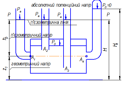 Основне рівняння гідростатики має розмірність довжини і тому може бути представлене у вигляді двох відрізків. z – геометрична висота положення частинки рідини;
